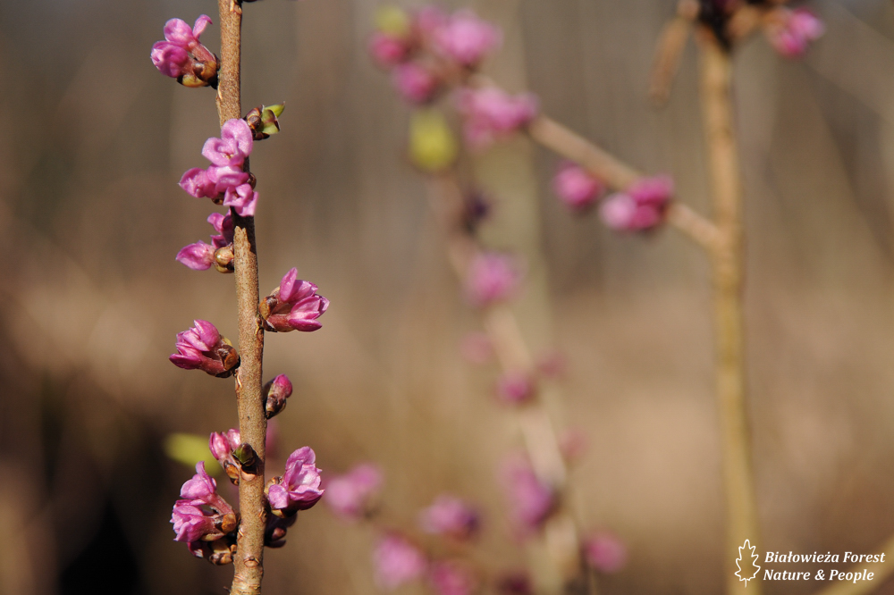 Wczesną wiosną drzewa w Puszczy są wciąż jeszcze w pąkach, jednak dno lasu zaczyna się już zielenić. Rozkwitają pierwsze kwiaty – niepozorne za to często w rozległych kobiercach – i ożywiają uśpiony dotąd las.